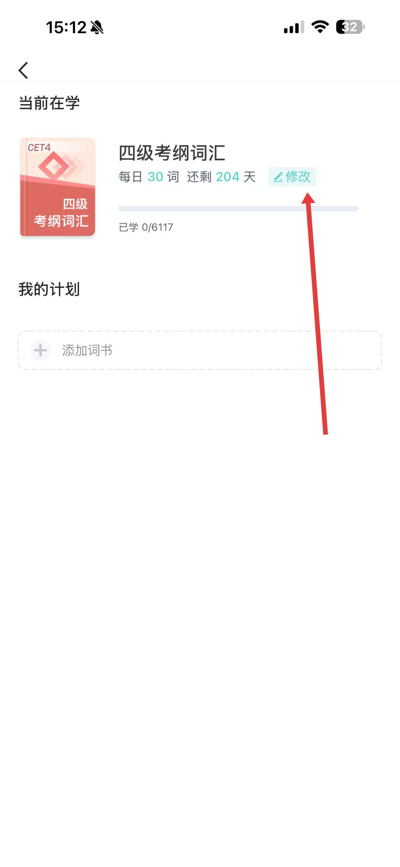 2、进入学习计划页面后,点击每日学习量旁边的修改选项。