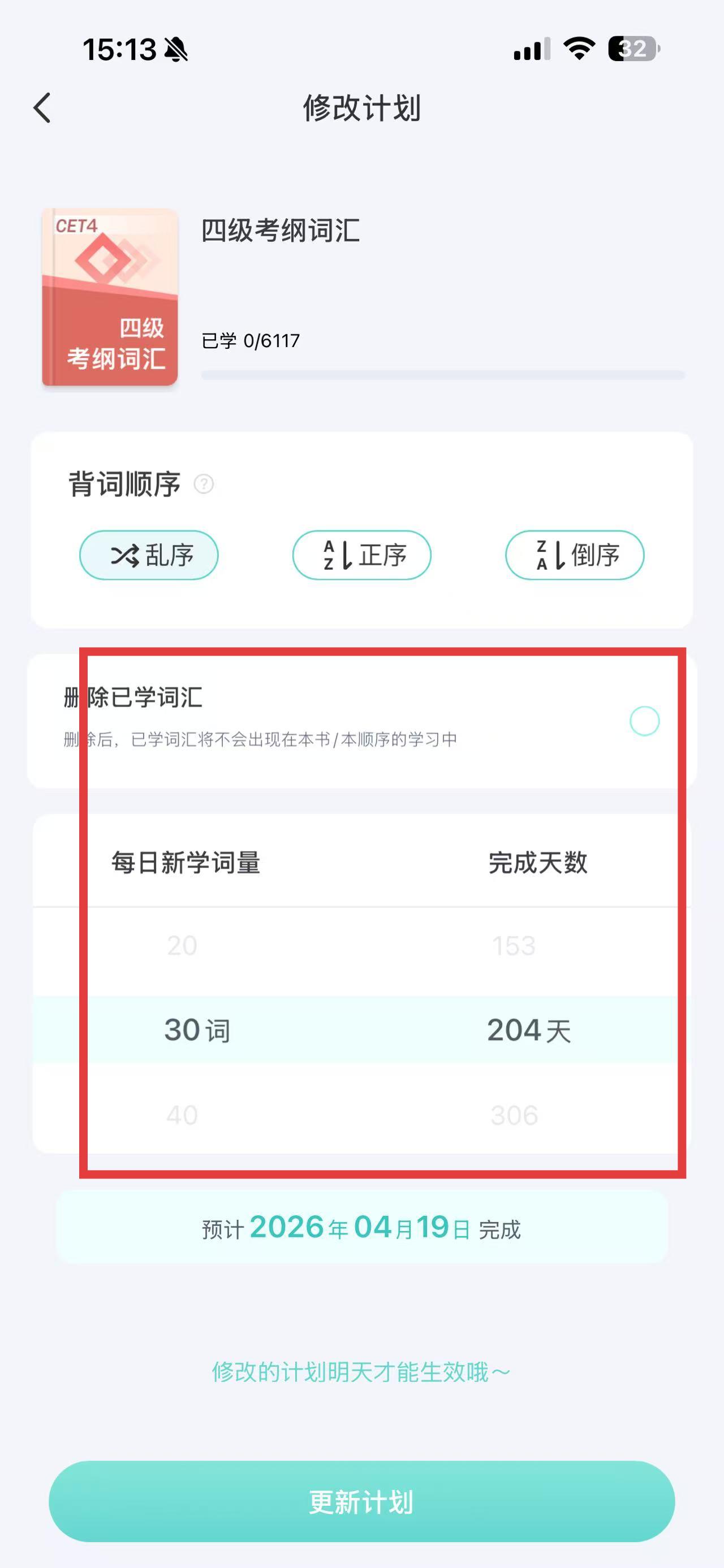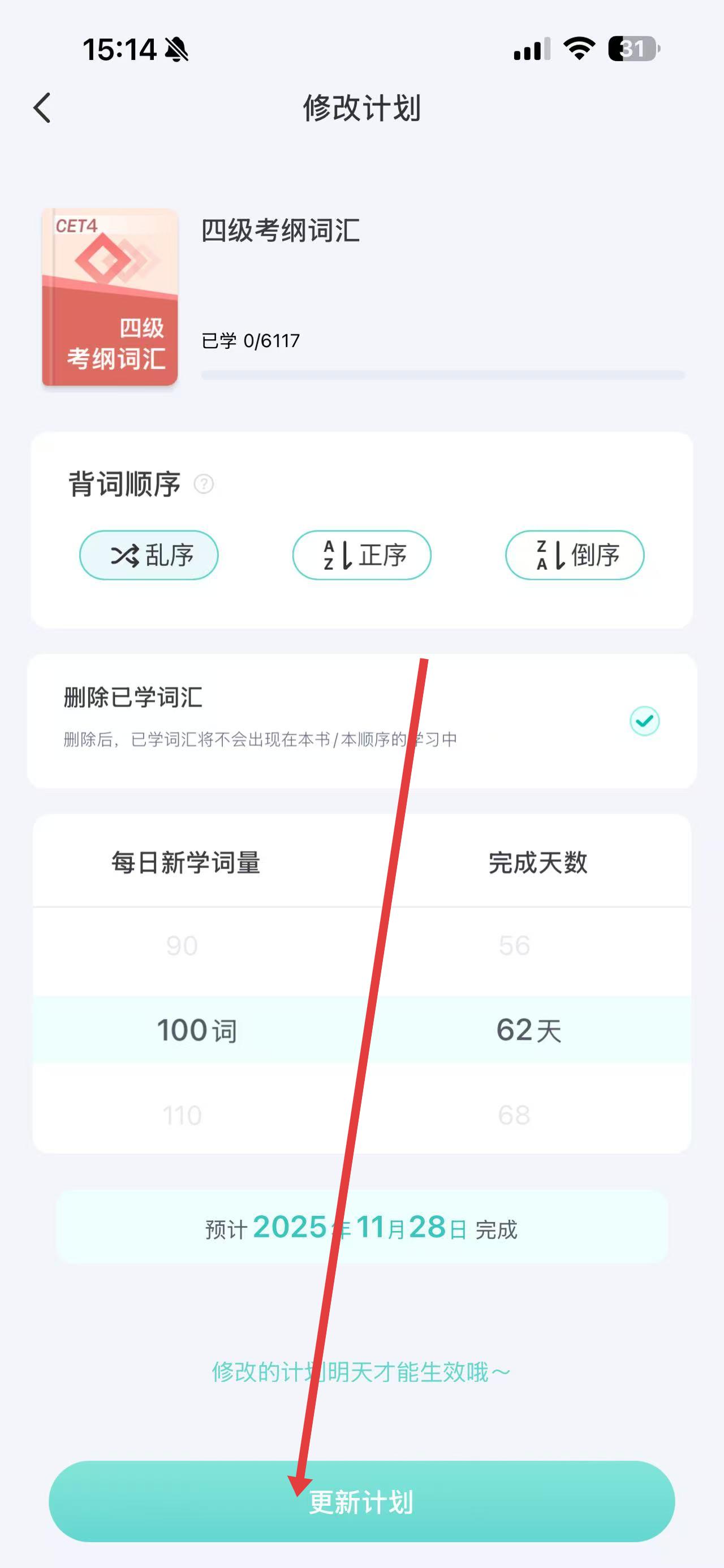 4、选择好每日新学词量后,点击页面下方的更新计划按钮,完成设置。