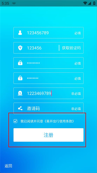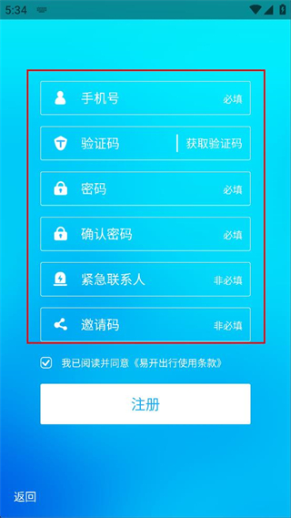 4、勾选我已阅读并同意相关条款的选项,点击注册按钮完成易开出行账号注册。