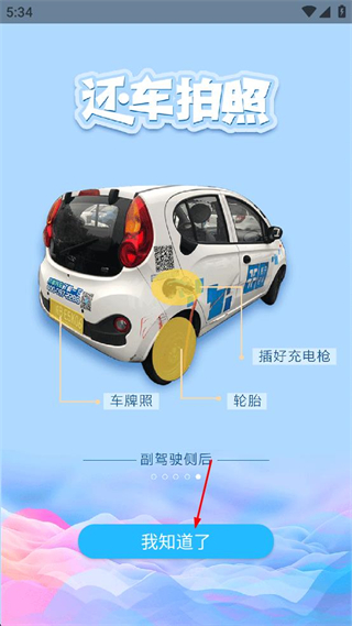 1、打开易开出行应用,查看还车拍照提示内容,点击我知道了按钮进入后续界面。