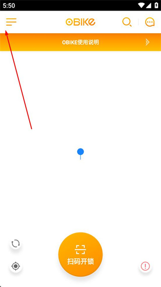 1、打开OBIKE应用,看到首页的扫码开锁按钮,点击左上角的菜单按钮,进入用户指南页面。