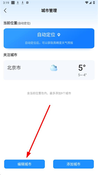 3、在城市管理页面,点击底部的编辑城市按钮,进入城市的编辑状态。
