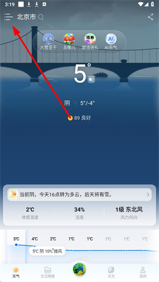 1、在最美天气app界面左上角,点击菜单按钮,进入功能页面。