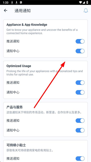4、在通用通知界面,找到对应分类下的推送通知开关,点击开关将其关闭,即可停止该类别的推送消息。
