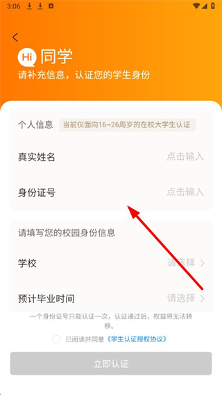 3、在学生认证页面,依次填写个人信息,选择学校,勾选同意协议,点击立即认证即可完成认证。