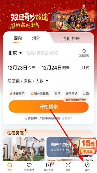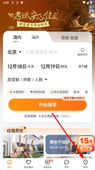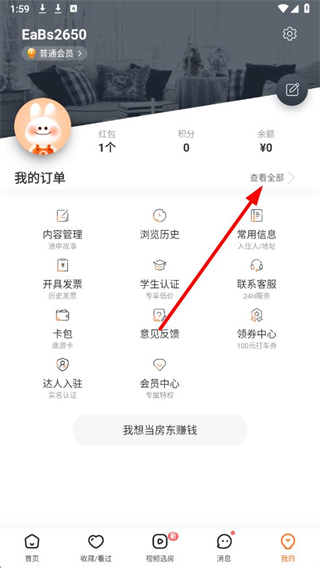 1、在途家民宿app主界面,点击右下角我的选项,进入个人中心页面。