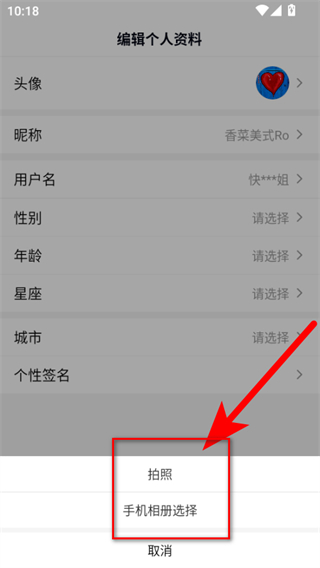 5、在弹出的选项中选择拍照或手机相册选择来更换新的头像。