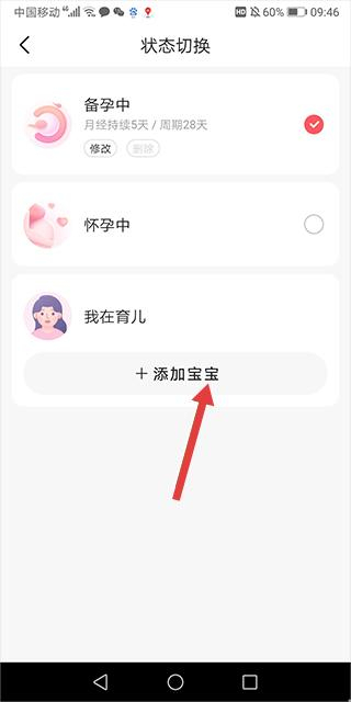 3、在状态切换页面,选择我在育儿,然后点击+添加宝宝。