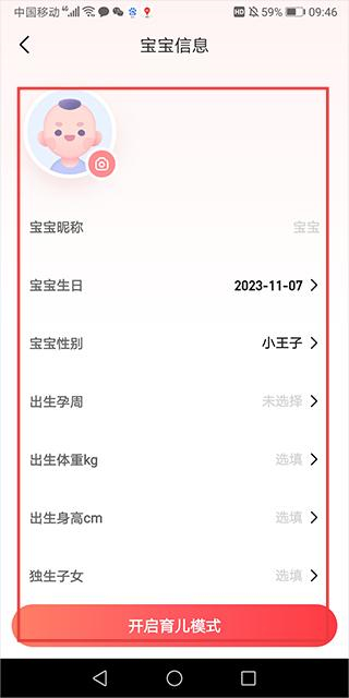 4、在宝宝信息页面,填写二胎的相关信息后,点击开启育儿模式完成添加。