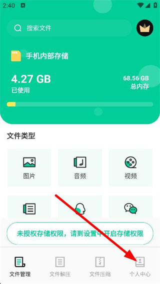 1、打开文件管理,先在弹窗中点击同意并继续。