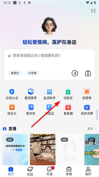 1、在老来健康首页,找到找医生功能入口并点击,进入开方购药的咨询界面。
