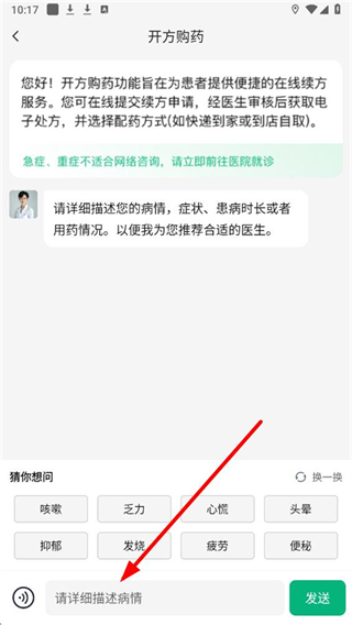 2、进入界面后,可选择症状标签,或手动描述病情后点击发送,提交需求。