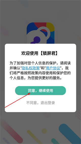 1、打开锁屏君后出现欢迎弹窗,阅读隐私政策和用户协议,点击同意继续使用按钮。