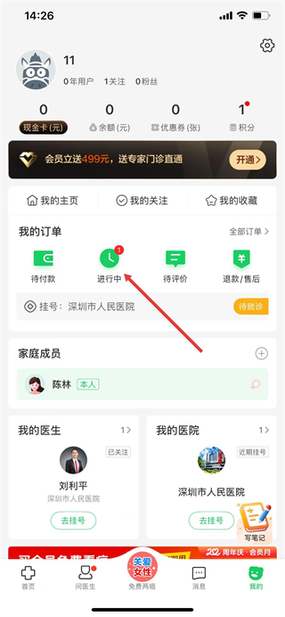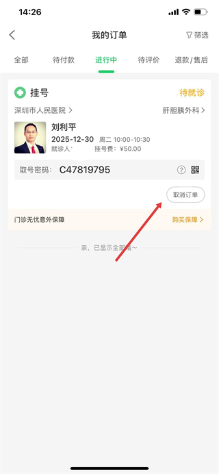 3、在我的订单页面,找到目标挂号订单并点击取消订单按钮。