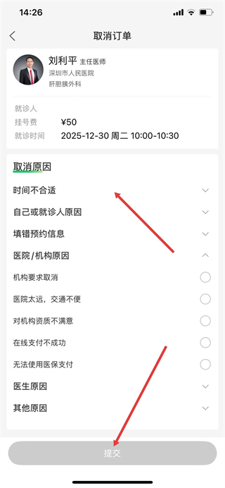 5、选择取消原因后,点击提交完成预约取消。