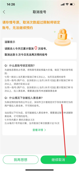 4、在取消挂号页面,点击继续取消按钮。