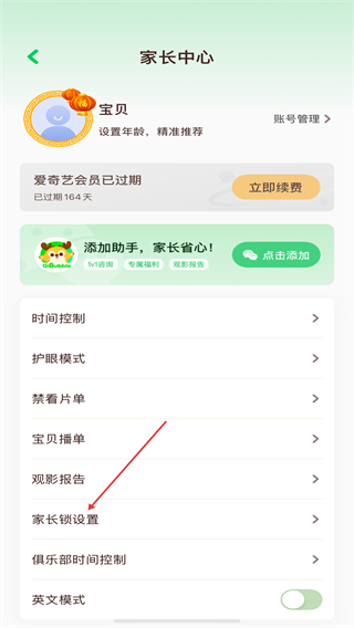 1、在家长中心页面,点击家长锁设置选项,进入解锁方式选择界面。