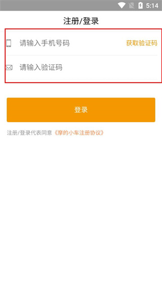 1、打开摩的小车应用,进入注册/登录页面,找到请输入手机号码输入框,填写对应的号码。
