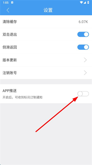 3、在设置界面,找到APP推送选项,点击其右侧的开关按钮将其开启,开启后可收到标讯订制通知。