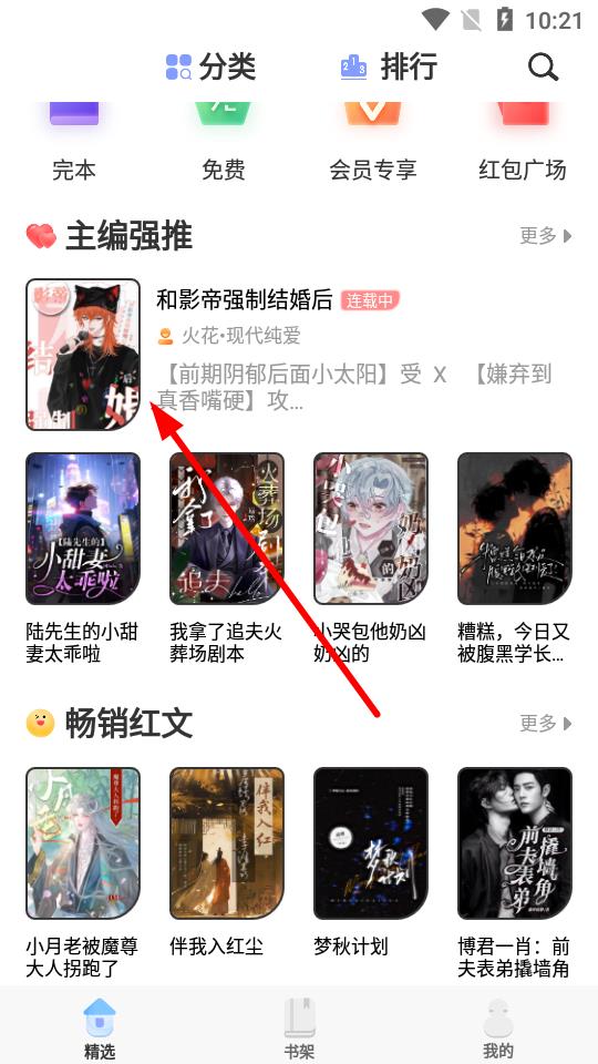 2、在精选页面中,选择想要阅读的小说,例如和影帝强制结婚后。