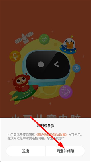 1、打开小寻智能App,在弹出的声明与条款中点击同意并继续。