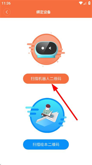 2、进入绑定设备页面后,找到并点击扫描机器人二维码选项。