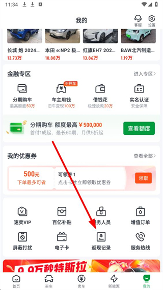2、在我的页面中,找到返现记录选项,点击即可进入对应的记录页面。