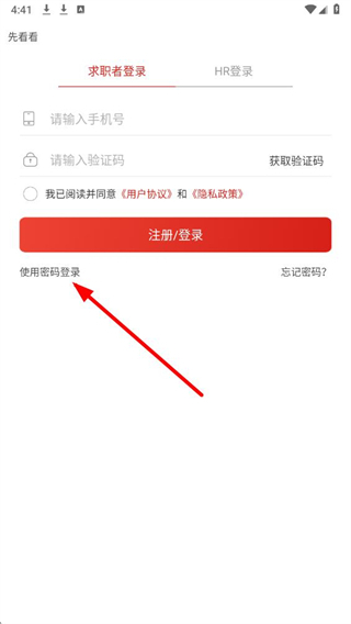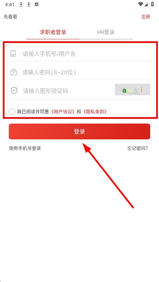 4、在求职者登录页面,输入手机号,输入验证码,勾选我已阅读并同意用户协议和隐私政策,点击注册/登录。