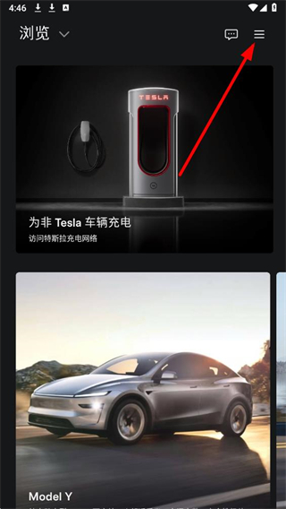 1、打开特斯拉app,在浏览界面点击右上角三条横线图标进入菜单。