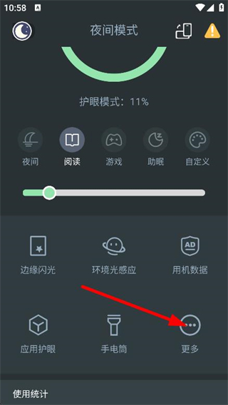 1、打开夜间模式软件,在主界面中点击更多选项,进入更多设置页面。