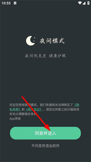 1、打开夜间模式app,在初始弹窗中点击同意并进入。
