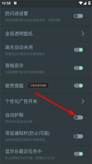 3、找到自动护眼,点击按钮,即可开启自动护眼模式。