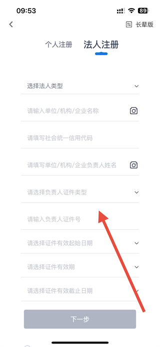 4、在法人注册页面,依次填写法人类型、单位名称等信息,勾选协议后,点击下一步完成注册。