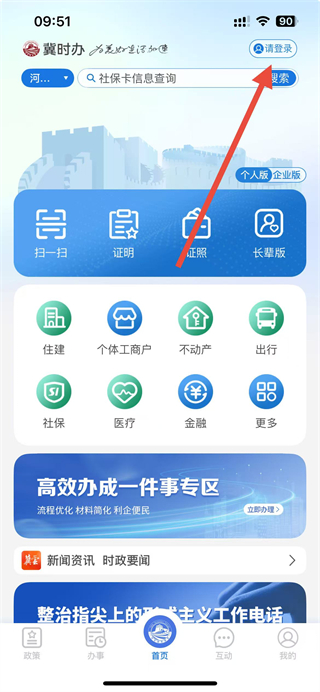 1、点击冀时办页面右上角的请登录选项,进入登录相关操作页面。