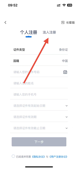3、在注册页面,点击切换至法人注册标签,进入法人账号的注册信息填写页面。