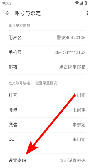4、在账号与绑定页面,点击设置密码选项进入密码设置的操作界面。