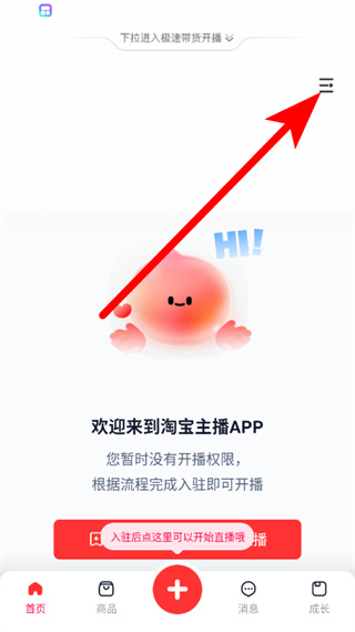 1、在淘宝主播APP首页,点击右上角菜单按钮,展开功能选项列表。