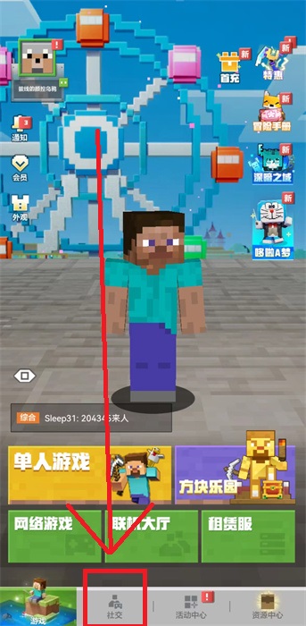 1、打开游戏进入到游戏主界面中之后,我们需要点击下方导航栏中的【社交】进入到游戏社交界面中;