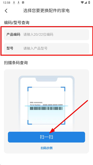 3、在配件购买页面,可通过产品编码和型号填写信息,或点击扫一扫扫描家电条码,完成购买支付即可获取配件。