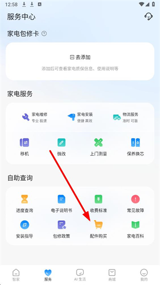 2、在服务中心页面的自助查询板块中,找到配件购买选项并点击。