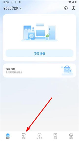 1、进入海尔智家app,点击底部服务选项,进入服务中心页面。