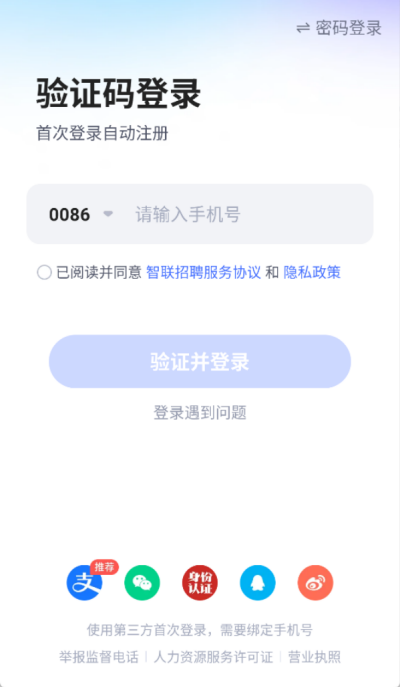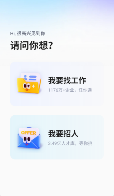 1、首先打开下载好的智联招聘APP,进入软件后选择自己的想法,是要找工作还是招人,根据自己的需求去选择;