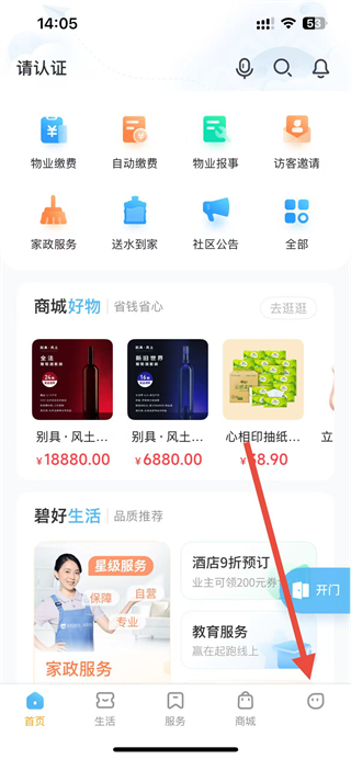 1、在首页点击底部服务选项,进入含认证业主功能的页面。