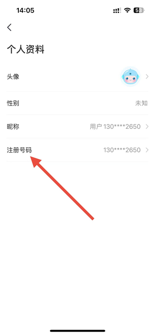 3、在个人资料页面里,找到注册号码选项并点击,跳转至更改手机号的操作界面。