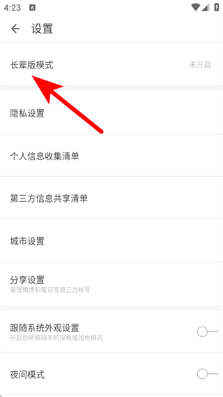 3、在设置页点击长辈版模式,进入长辈模式的设置页面。