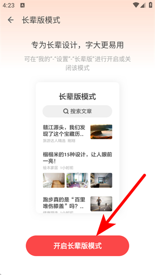 4、在长辈版模式页点击开启长辈版模式,完成功能开启操作。