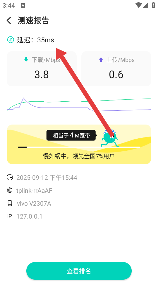 4、测速结束后,自动跳转到测速报告页面,查看延迟等网络状态数据。