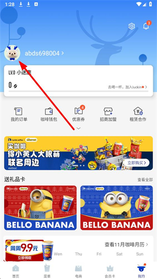 1、打开瑞幸咖啡app,在我的页面,点击头像区域,进入个人资料页面。