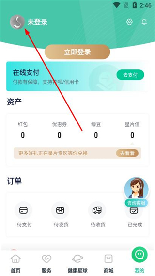 2、在我的页面,点击未登录区域进入登录界面。