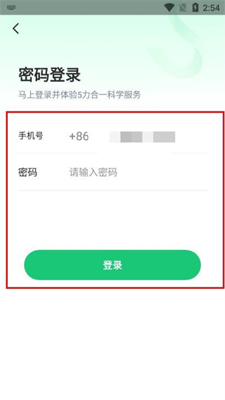 3、在密码登录页面输入手机号和密码,点击登录完成账号登录。